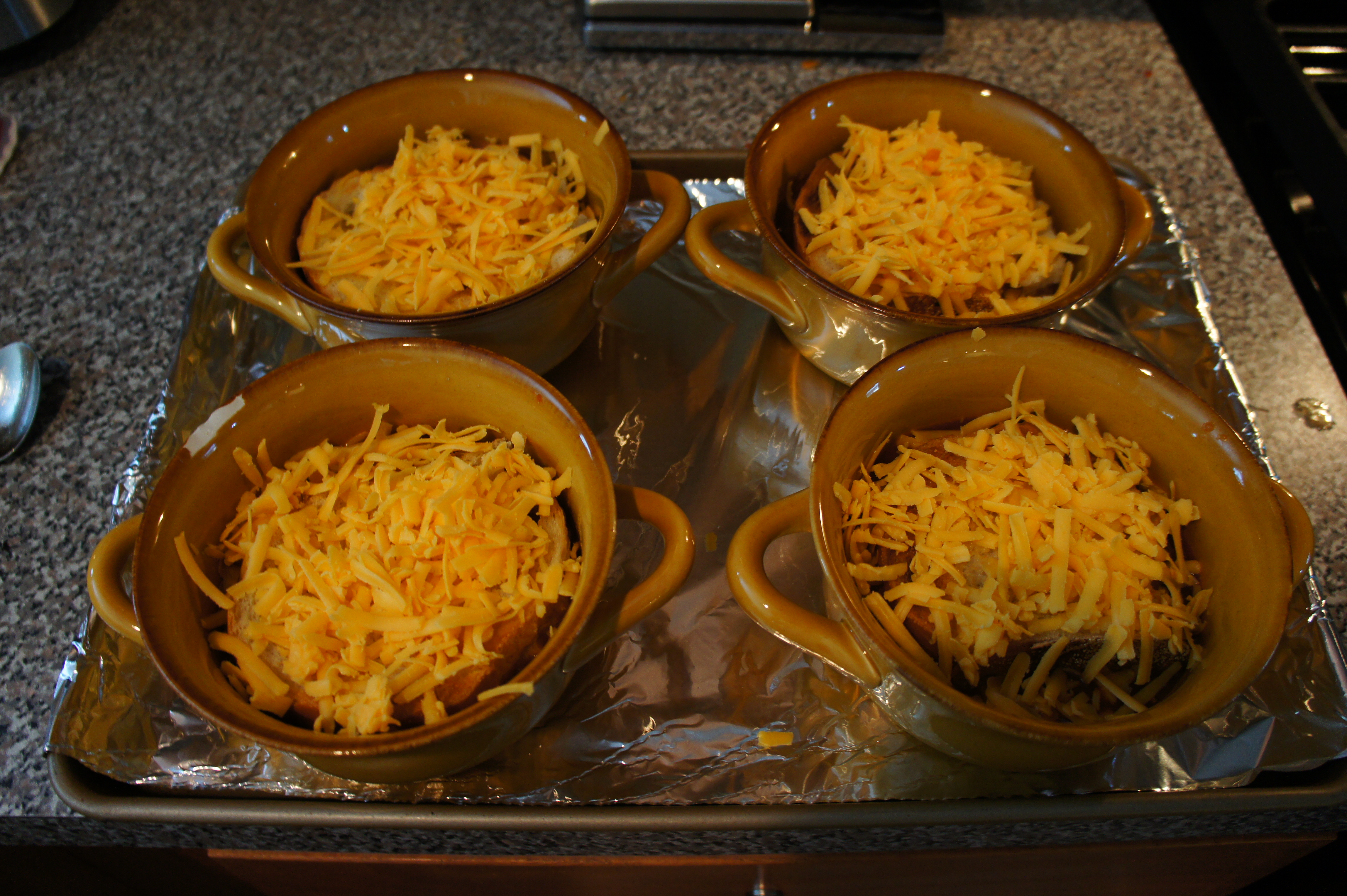 Preheat oven to 350°F. Re-foil your large baking sheet and place four oven-proof soup bowls on top. Stir grated onion into warm soup. Ladle evenly into the four bowls. Toast bread slices until golden brown. Brush one side of bread evenly with butter. Place bread in bowl, buttered side up.