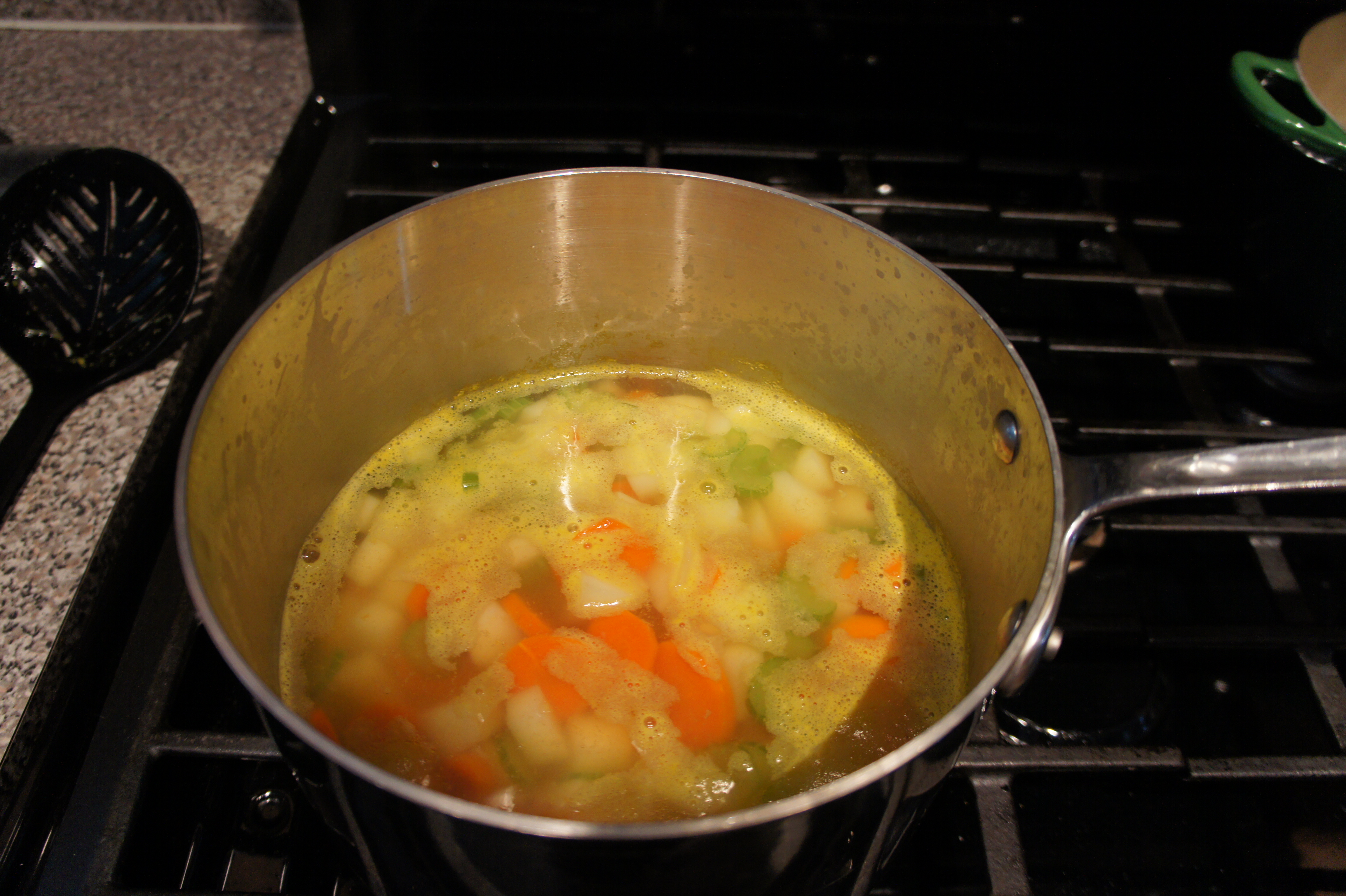 In a large pot, bring stock to a boil and add carrots, celery, and potatoes. Simmer for about 15 minutes, or until veggies are tender. Remove veggies with slotted spoon and pour stock in a large measuring cup to save for later.