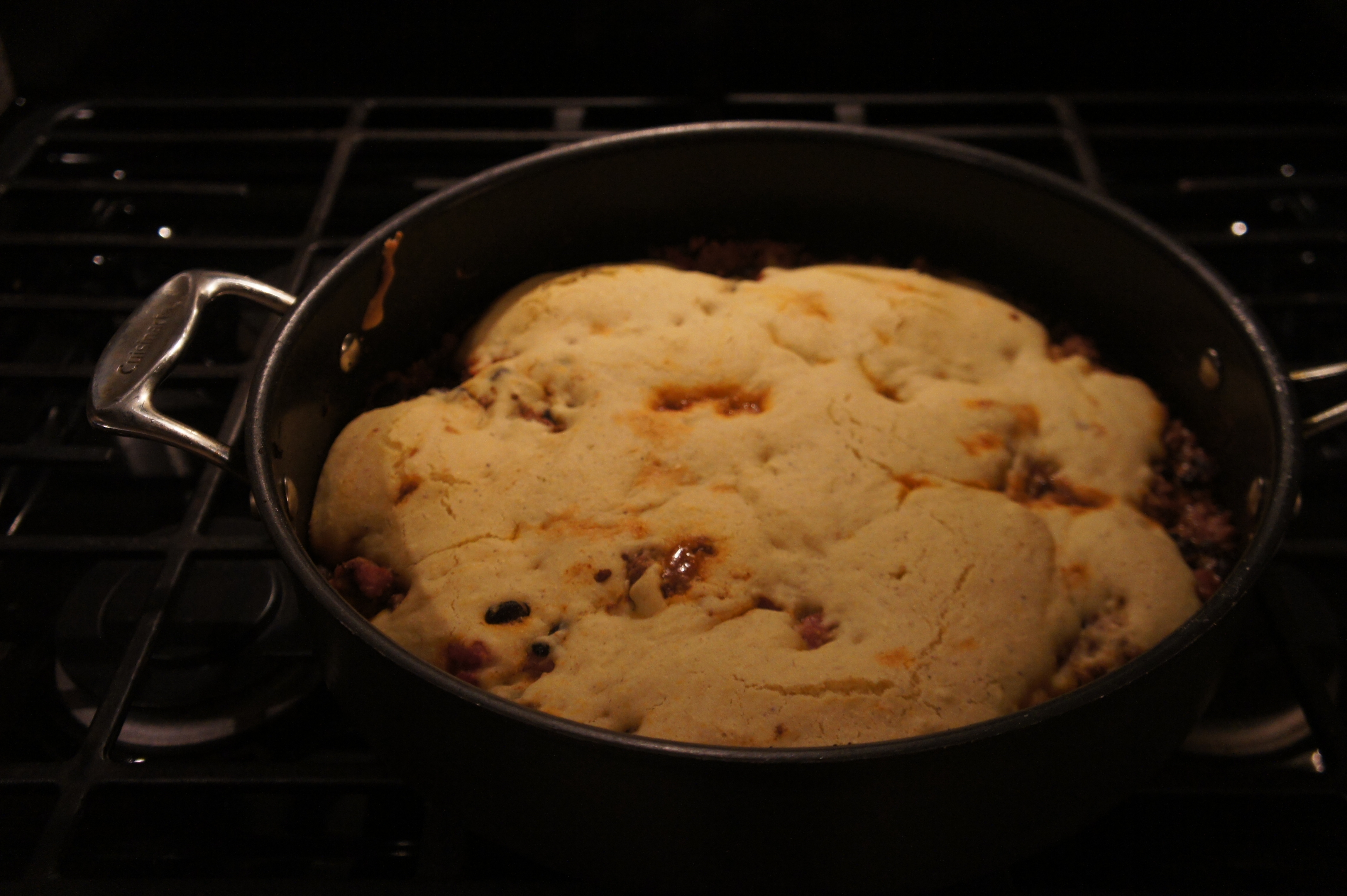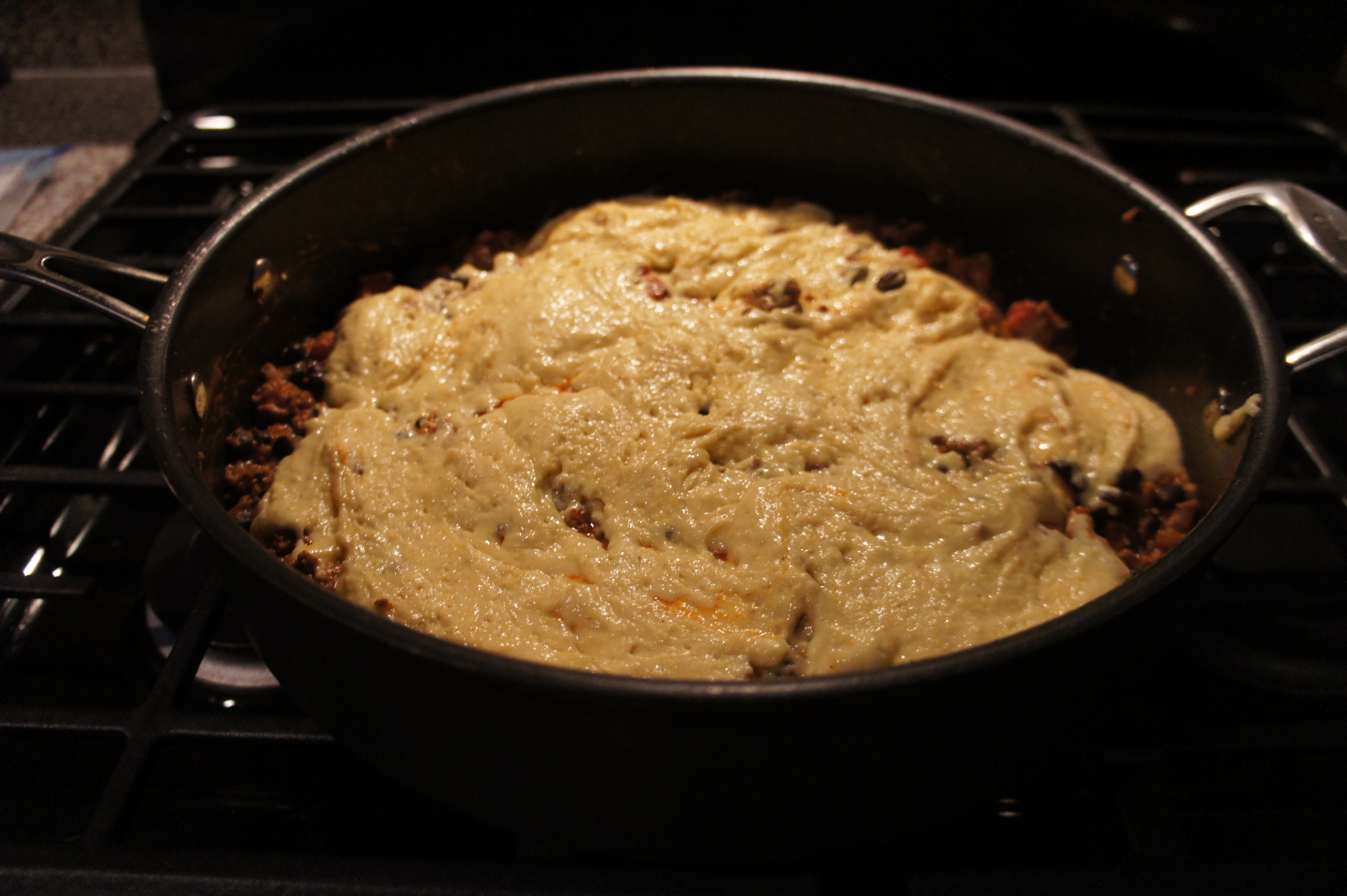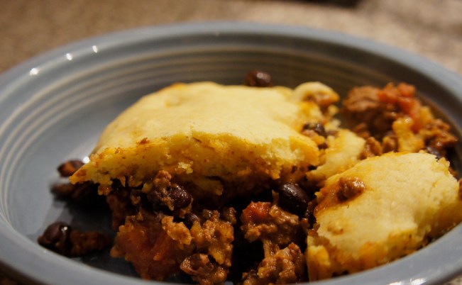 Dollop the cornbread batter evenly oven the filling and spread into an even layer. Bake until the cornbread is cooked through in the center, 10 to 15 minutes. Serve.