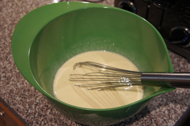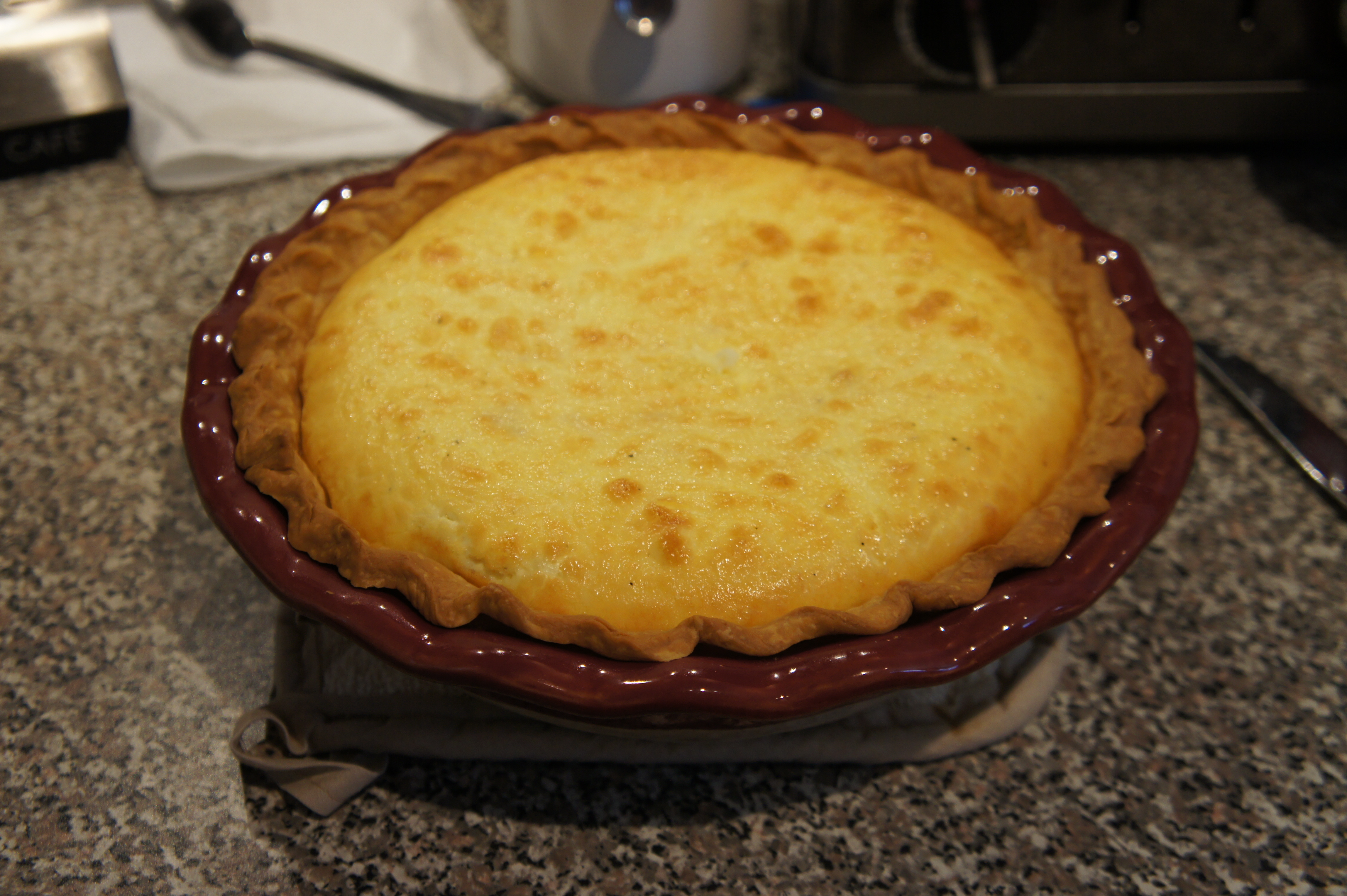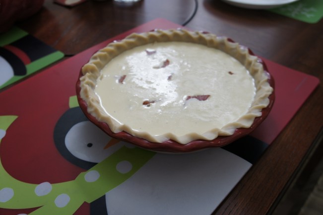 Beat eggs, cream, mustard, salt and pepper until well combined and smooth. Pour into pie shell.