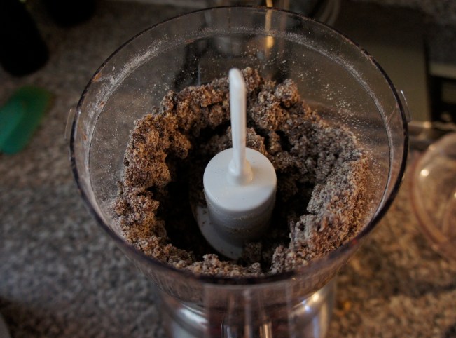 Add remaining chocolate and cinnamon to processor and pulse to coarse crumbs. Add the egg yolk to the processor along with the 3 ½ tablespoons butter and ½ cup flour. Pulse until you get a coarse, crumbly mixture. Set aside.