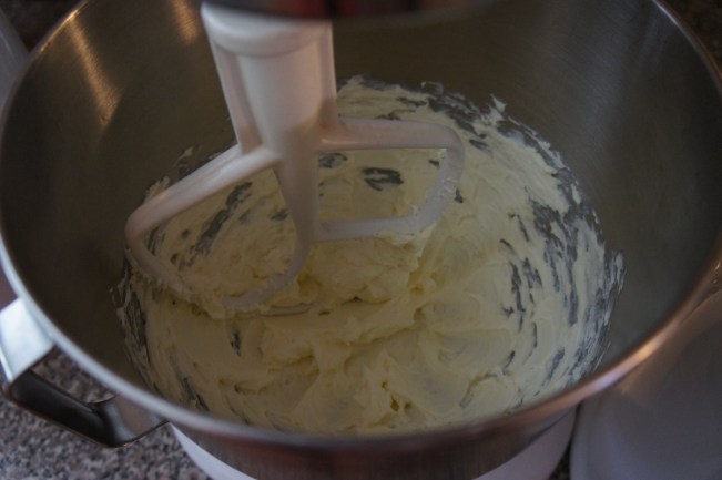 Beat the butter and cream cheese together, then beat in sugar. When light and fluffy, beat in the eggs one at a time and almond extract.
