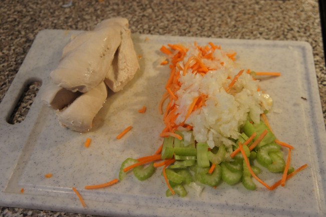 Bring water to boil in medium pot for chicken while you prepare and chop the vegetables. Once boiling, add the chicken breasts and cook 15 to 20 minutes until fully cooked. Cube chicken.
