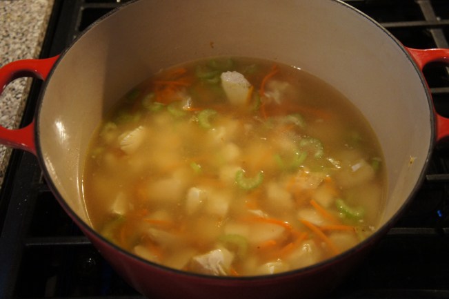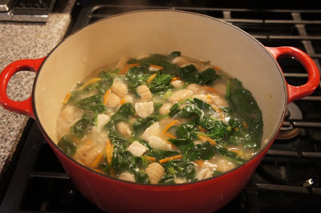Stir in cubed chicken and chicken broth. Bring to simmer. Stir gnocchi into the simmering soup and cook until they begin to float, 3 to 4 minutes.
