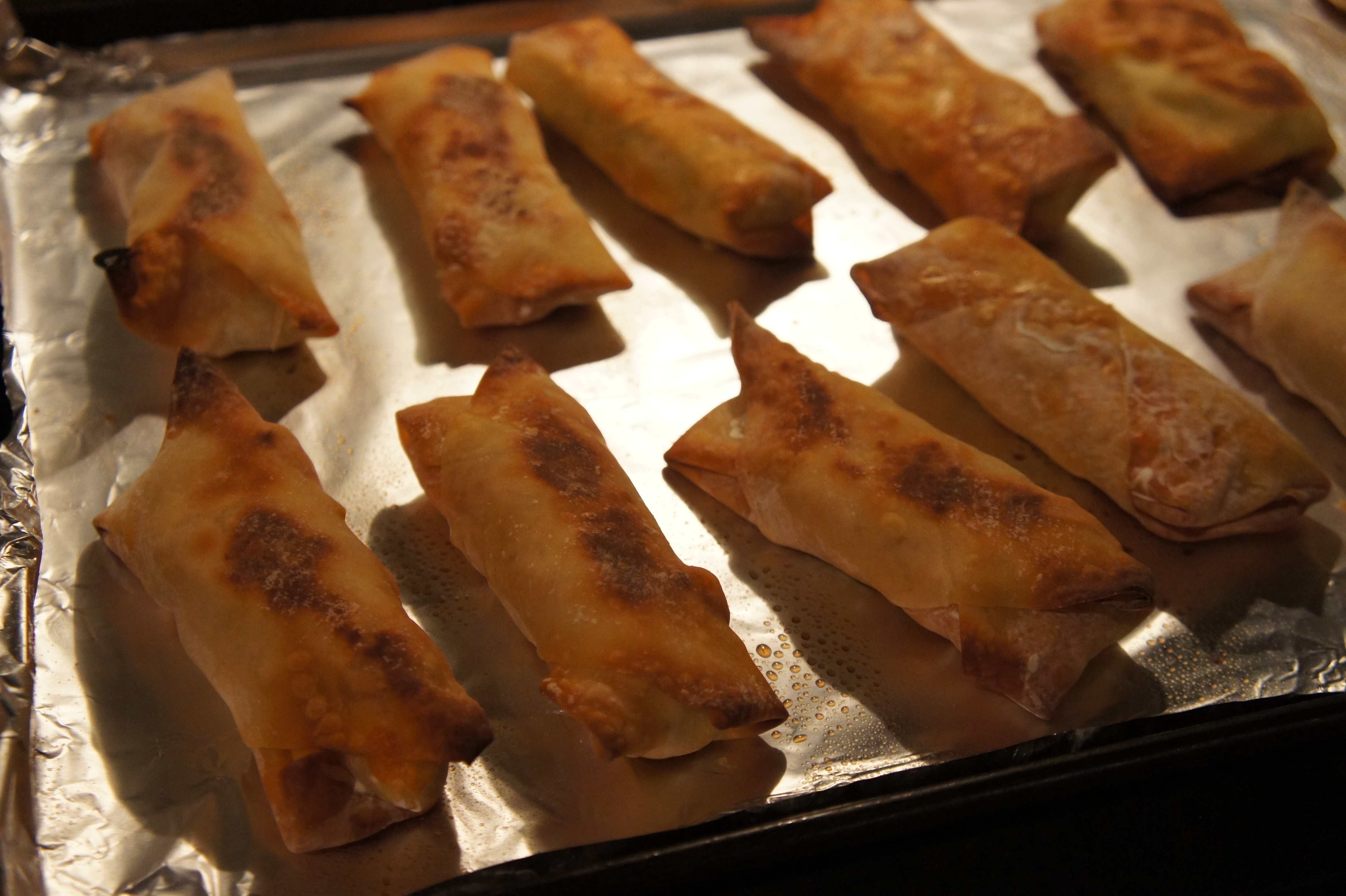 Bake for 10 minutes. Flip the egg rolls over and continue baking for an additional 10 minutes.