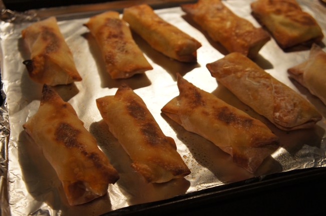 Place egg rolls on a foiled lined cookie sheet and spray the tops with nonstick cooking spray.
