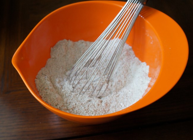 In a medium bowl, whisk together the flours, sugar, baking soda, and salt. Set aside.