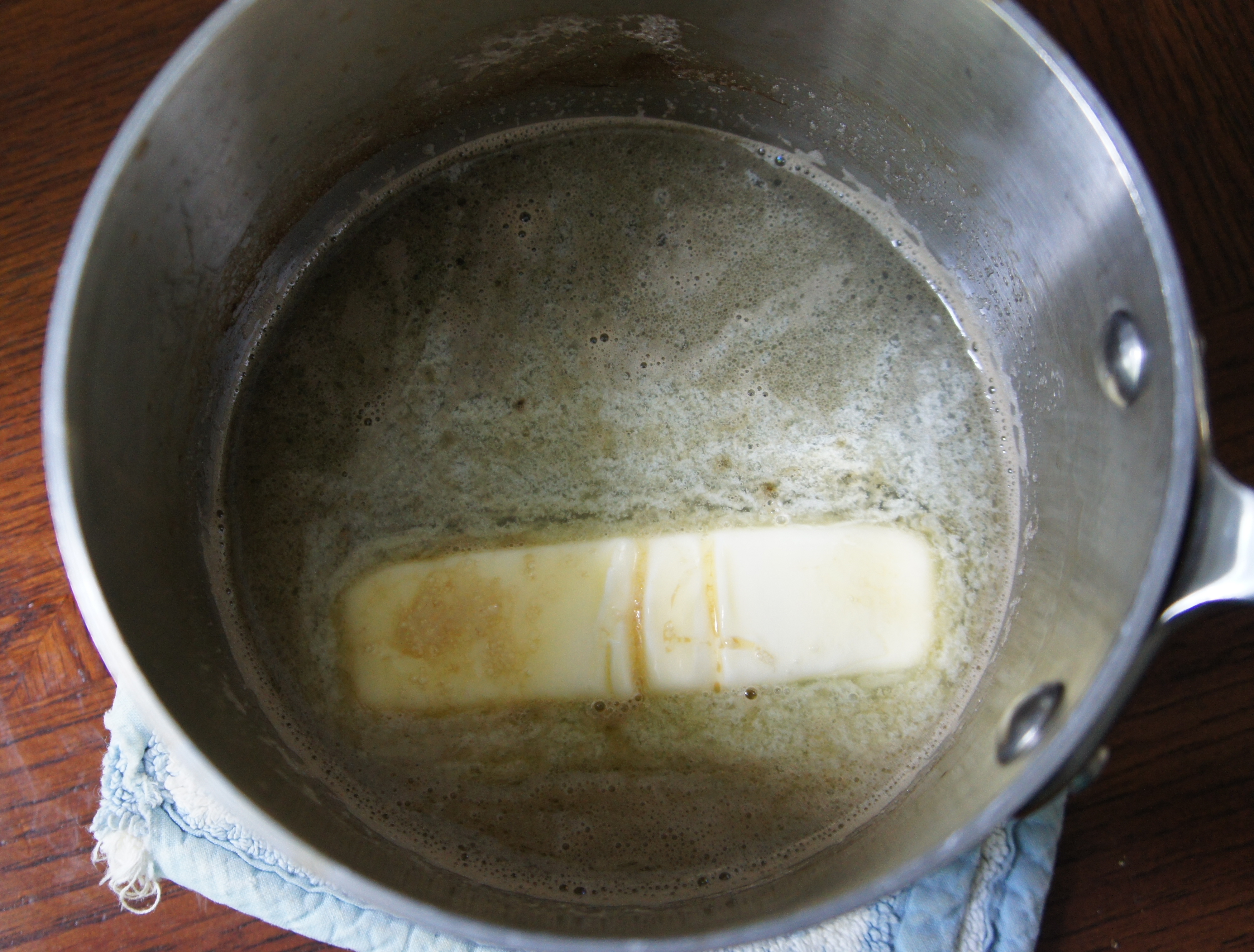 In a saucepan simmer the beer down to 1 cup. Remove from heat and add the butter. Stir until melted. (Why, hello Butter Beer.)