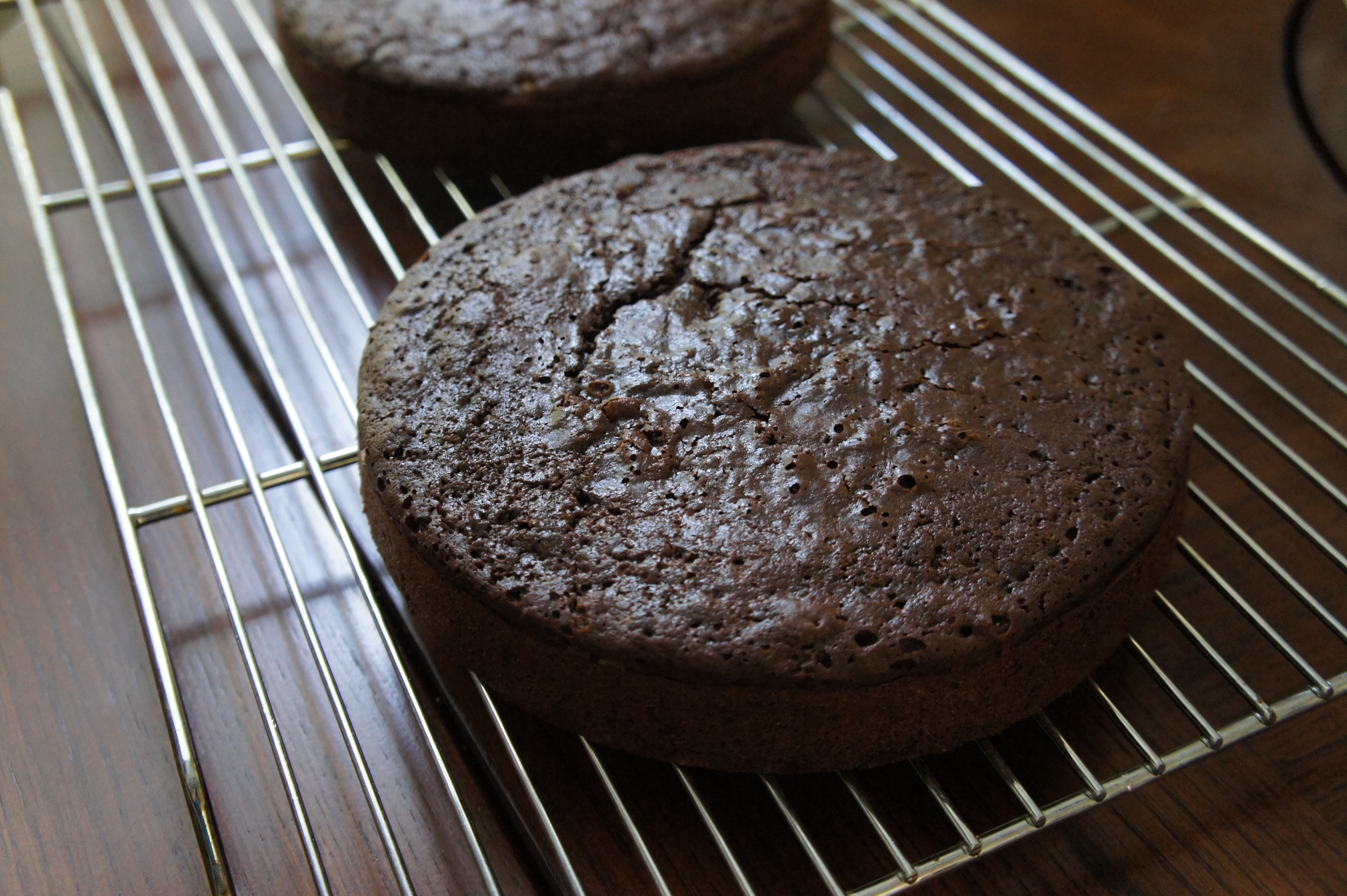 Transfer the batter to the prepared pans and bake for 30 minutes or until a knife inserted in the center comes out clean. (Err on the slightly moist side if anything.) Remove from the oven, and turn out onto a cooling rack after five minutes.