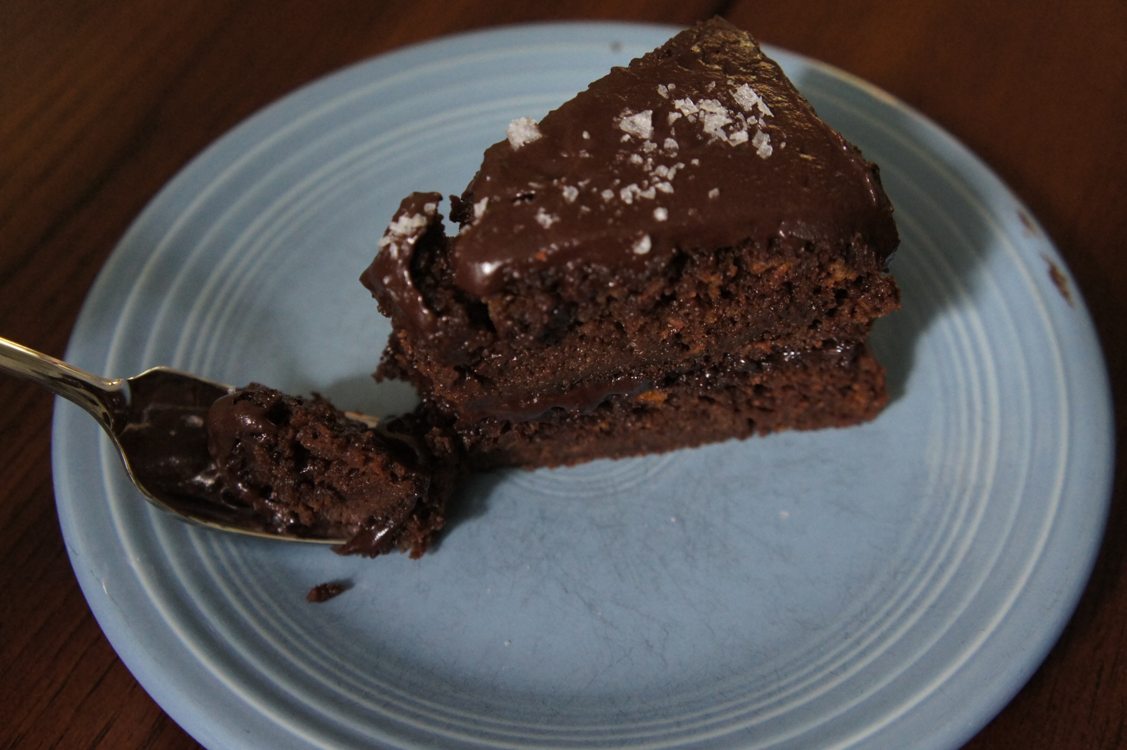 Frost the top of the first layer once cooled. Follow with the remaining layer. Sprinkle with a bit of flaky sea salt and serve.