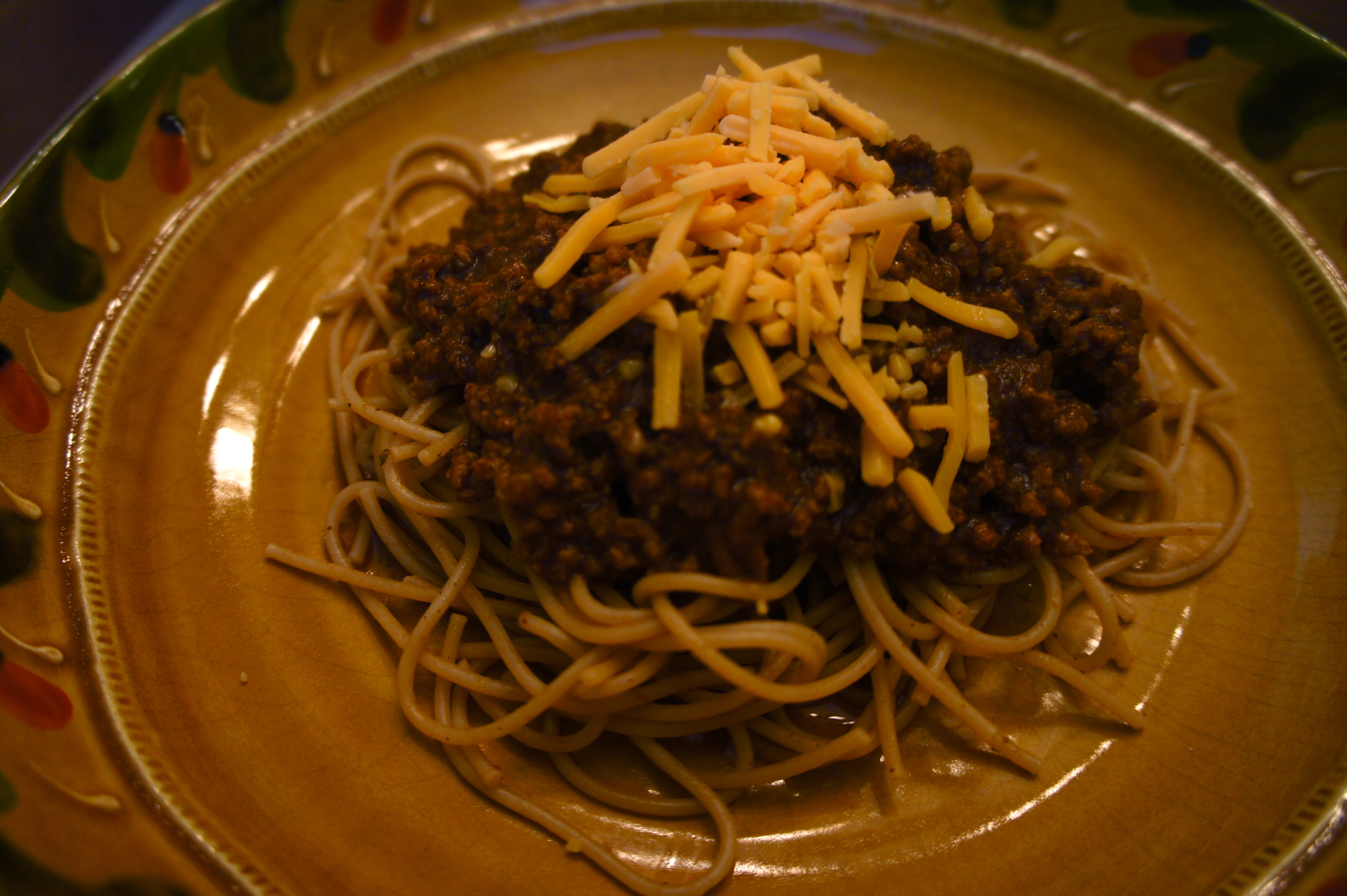 Now, I’ve never been to Cincinnati but according to this recipe, this is how they eat chili. The spices include cinnamon and oregano (along with the usual chili powder and tomato bases) which give it its unique flavor. The consistency is on the thinner side allowing the spaghetti to soak up each morsel of chili. My inner first-grader can’t help going back for seconds.
