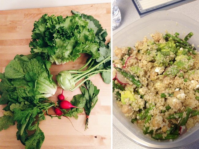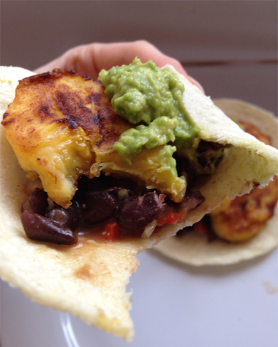 Photo Jun 21, 18 31 06 (1) I’m really excited about sharing this recipe. The inspiration comes from Venezuelan arepas, griddle-fried corncakes often filled with various combinations of beef, chicken, cheese, guacamole, plantains, and chorizo. I made an easier version, subbing in pre-made corn tortillas topped with a vegetarian-friendly rendition of Cuban black beans and quick fried plantains. taco The salty/sweet taco gets an extra dose of delicious with lazy guacamole. I’ve eaten these tacos the past three days and they’re fantastic fresh and reheated.  You really can’t go wrong with salty and sweet. (See pretzels and chocolate.) csa-2-3 CSA Week Two update: I’m drowning in lettuce. I’m ashamed to admit it’s too many greens, even for me. I received kohlrabi again and made another stir-fry. The only other non-leafy produce was radishes, which I added to a quinoa dish of goat cheese, sauteed asparagus, avocado, and chickpeas with a lemon tahini dressing. It was fantastic. Tomorrow promises more varieties of lettuce, the last of the kohlrabi, and garlic scapes, which I’ve read make a really nice pesto. Ingredients: